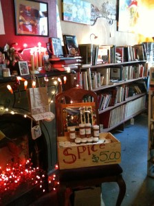 She cuts diagonally down Royal and again diagonally across Toulouse and spies the open door at Kitchen Witch Cook Books. She stops to chat about the Festival with its owners, neighbors and friends of hers. The couple are perennial TWiLFers as well. Lively talk among the 3 for a few minutes, then the female half of the couple kisses the male half goodbye and walks quickly to the corner of Decatur with lunch in hand.The man continues to talk to our heroine (arms folded, scrunched down a bit to be at eye level with her), while the cookbook dogs settle in for a long nap on the floor. On the way out she admires the mix of everything.