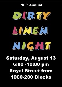 Sounds like plans are on their way for the 10th DLN. As many people know, it was the brainchild of Tracy Thomson and RHINO (way back when they were on Royal Street) to get folks to do a gallery walk in the French Quarter right after White Linen Night on Julia. A wild success since and also a way to make a night of it, get dinner at one of the many great restaurants in the Quarter and maybe even a foot massage right before starting the walk up and down Royal.