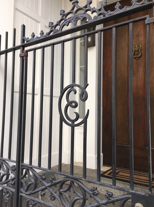 828 Burgundy. Could not find any last names beginning with an E, but did find a first name of Eugene (Claverie) and heirs listed as owner 1909-1966. In addition, a 1940s-ish picture on survey indicates the gate was not there at the time.