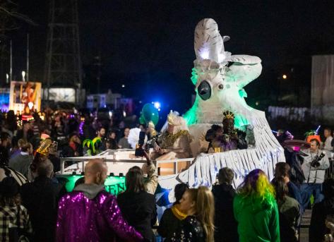 Krewe du Vieux is quite conscious of itself not just as an insurrection, but also as a resurrection, an effort to recover from the anti-carnivalesque aspects of the 19th century Uptown Carnival model. Their mission statement expresses this ambition explicitly: “We believe in exposing the world to the true nature of Mardi Gras — and in exposing ourselves to the world.” Since Katrina, Krewe du Vieux has been joined by several other downtown parading clubs — ‘ti Rex, Chewbacchus, Red Beans — each of which follows the Krewe du Vieux model far more faithfully than the Uptown one, especially by keeping dues affordable.