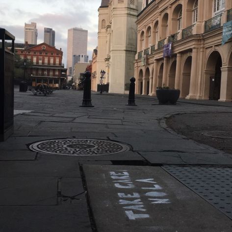 You’ll still see people walk a few times a day with their happy dogs, (saw a guy with his leashed ferret a few days ago), evening get togethers on carefully-spaced chairs on the street, a few tourists, and always some street people. The Mayor is slowly moving the homeless into hotels; the guy who lives in the window recess of the Presbytere Museum told me today that he had just missed the cut off to get in the Hilton Garden Inn by 6 people. I’d say the best way to describe his reaction was slightly stung. I told him they’ll find a place for him soon; he seemed to brighten at that. I think he looks forward to that mostly because he misses talking to people, he misses the hustle. I mean, even the silver guy’s paint is almost entirely worn off. The musicians who are staying in the apartment across the street come out to the balcony in the afternoon and play music quietly but seem to have little of the animation and long jams that they offered in the first days. You make eye contact with strangers, but there is a bit of a hesitation in being too chummy; you don’t want to encourage them to slow down and stay around here. Some neighbors have chalked “Go Home; Be Safe” on the sidewalks; but those who get it are already home, and those who don’t get it, won’t. It’s odd to see the energy seep out of these entertaining streets, but at least we have a strong reason to believe much of it will return. In the meantime, we can save ourselves, our friends, and our neighbors by killing as much of it as possible. #nolacorona