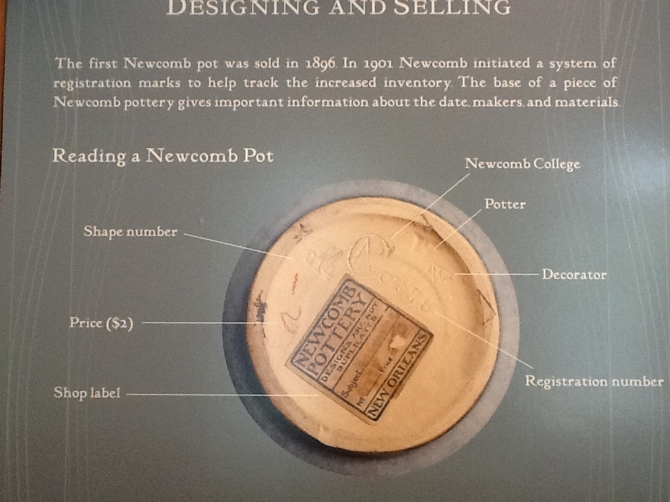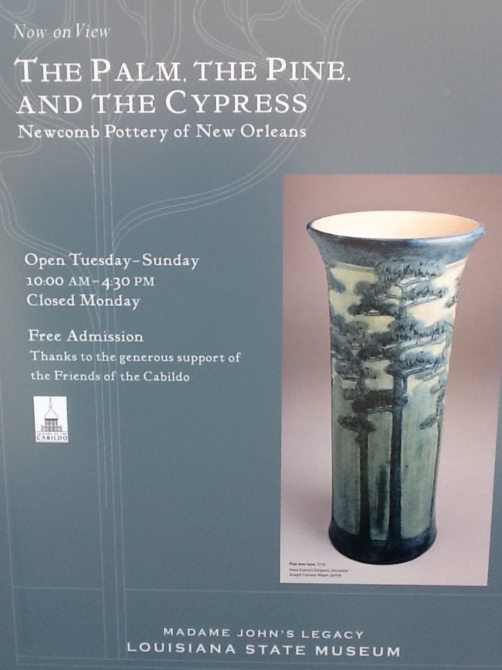 I was the only person in there until the end when a couple of French men came in and went directly to the house descriptions rather than to the Newcomb exhibit. The exhibit is set up in 4 rooms, with one or two cases in each laid out in different periods. For those unfamiliar with Newcomb, pottery or even the name, it was a celebrated liberal arts women’s college at Tulane University. Until 2006 that is, and then scandalously to many Newcomb graduates, the management of Tulane ceased the operation of this endowed college and folded it and its endowment into the larger university. I can understand the argument that there may not be a need for a women’s college any longer but talk about kicking people when they’re down…